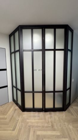* встроенный стеклянный шкаф также из натурального дерева в коридоре с подсветкой — удобно и современно;