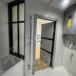 Так же в ванной комнате установлено стильное окно из натурального дерева с чёрной рамой и матовыми стёклами. Чёткие линии переплётов создают геометрический акцент, подчёркивая современный дизайн помещения.