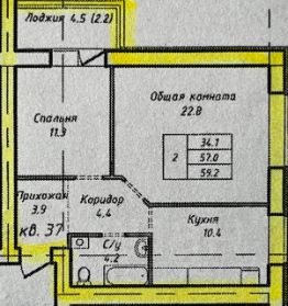 Жилая площадь составляет 34.1 квадратный метр, что предоставляет достаточно места для комфортного размещения мебели и создания индивидуального интерьера. Кухня площадью 10.4 квадратных метра станет отличным местом для семейных завтраков и ужинов.