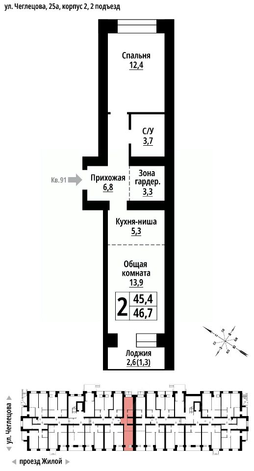 Продаётся 2-комнатная квартира в строящемся доме (Корпус 2), срок сдачи: II-кв. 2027, общей площадью 46 кв.м., на 9 этаже. ЖК "Тургенев" на ул. Чеглецова, 25а представляет из себя два кирпичных здания высотой 9 этажей.