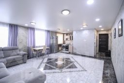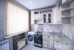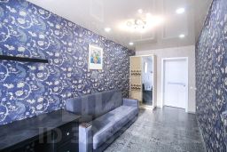 На полу керамогранит, функциональная встроенная мебель на кухне, натяжные потолки, хорошее правильное освещение в квартире. В спальной комнате есть теплый пол. Мебель и техника остается новым собственникам.