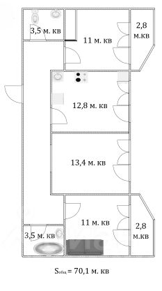 Площадь квартиры составляет 70.10 квадратных метров, включая просторную кухню площадью 12,8 кв.м.