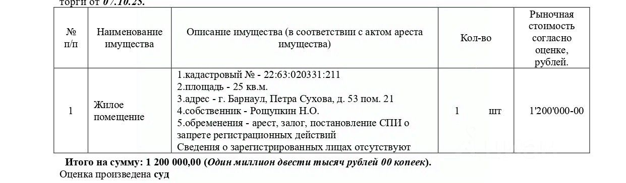 Жилое помещение, кадастровый 22:63:020331:211, площадь 25 кв.м., адрес: Алтайский край, г. Барнаул, Петра Сухова, д. 53, пом. 21. Начальная цена 1 020 000 руб. (Рощупкин Н.О., ипотека, арест, запрещения регистрации) (1832) (повторные)
