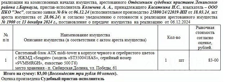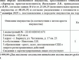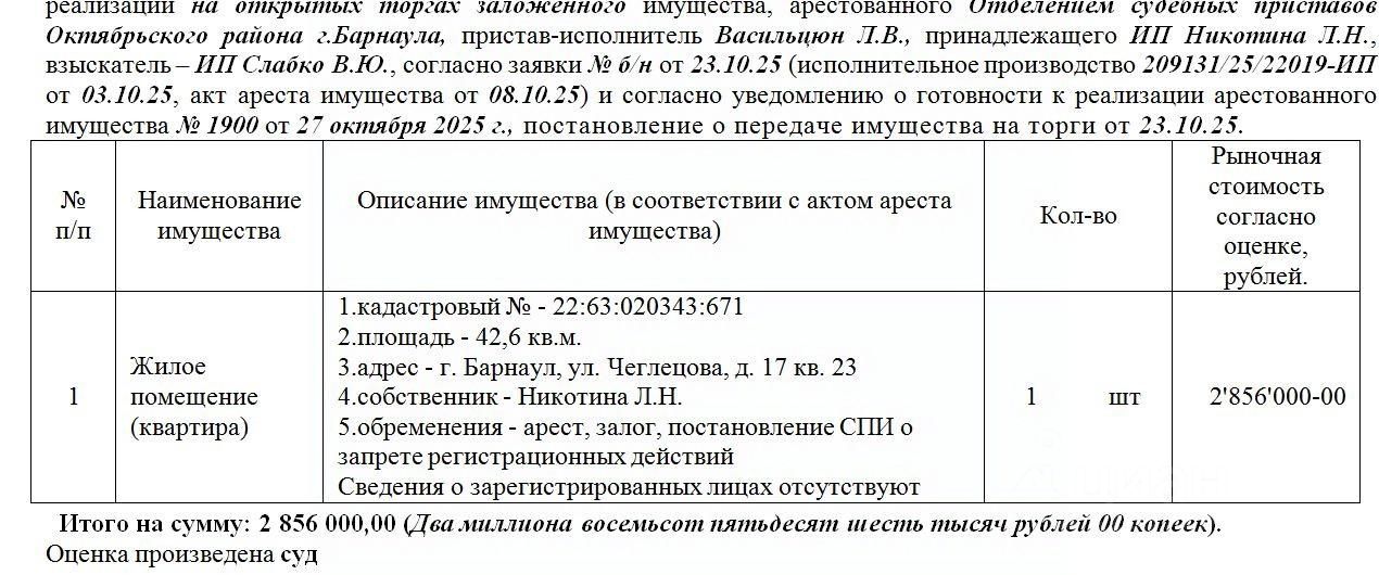 Лот1 Жилое помещение, кад. 22:63:020343:671, S- 42,6 кв.м., адрес: АК, г. Барнаул, ул. Чеглецова, д. 17 кв. 23. Нач. цена 2427600 руб. Сведения о зарегист. лицах отсут. (ИП Никотина Л.Н.-должник, Никотина Л.Н.-собственник, арест, залог, постановление СПИ о запрете р/д) (1900) (повторные)