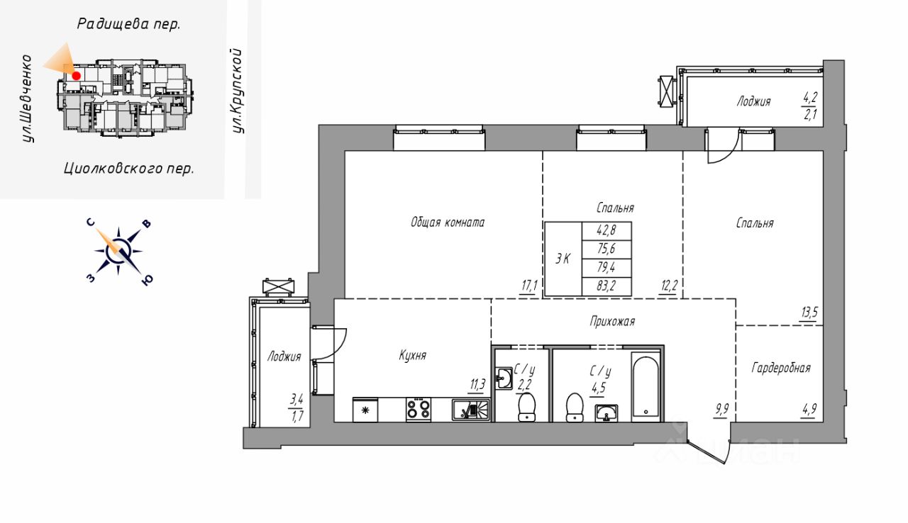 Продаётся 3-комнатная квартира в строящемся доме (Дом 1), срок сдачи: IV-кв. 2027, общей площадью 83.2 кв.м., на 16 этаже. Новый жилой комплекс "На Крупской, 100" от группы компаний "Строительная Перспектива ПСК" расположен по адресу: г. Барнаул, по ул. Крупской.