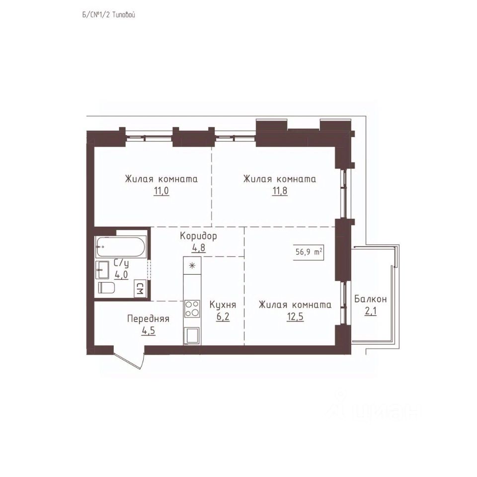 Общая площадь56,9 м²