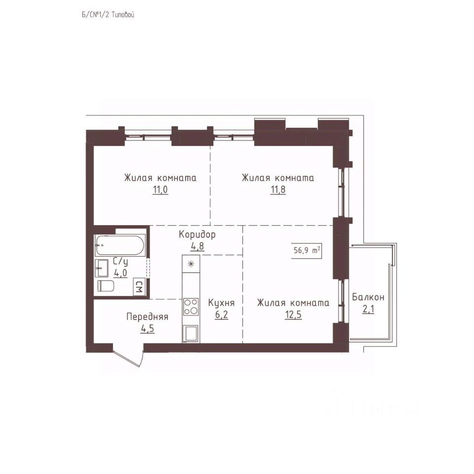 Общая площадь56,9 м²