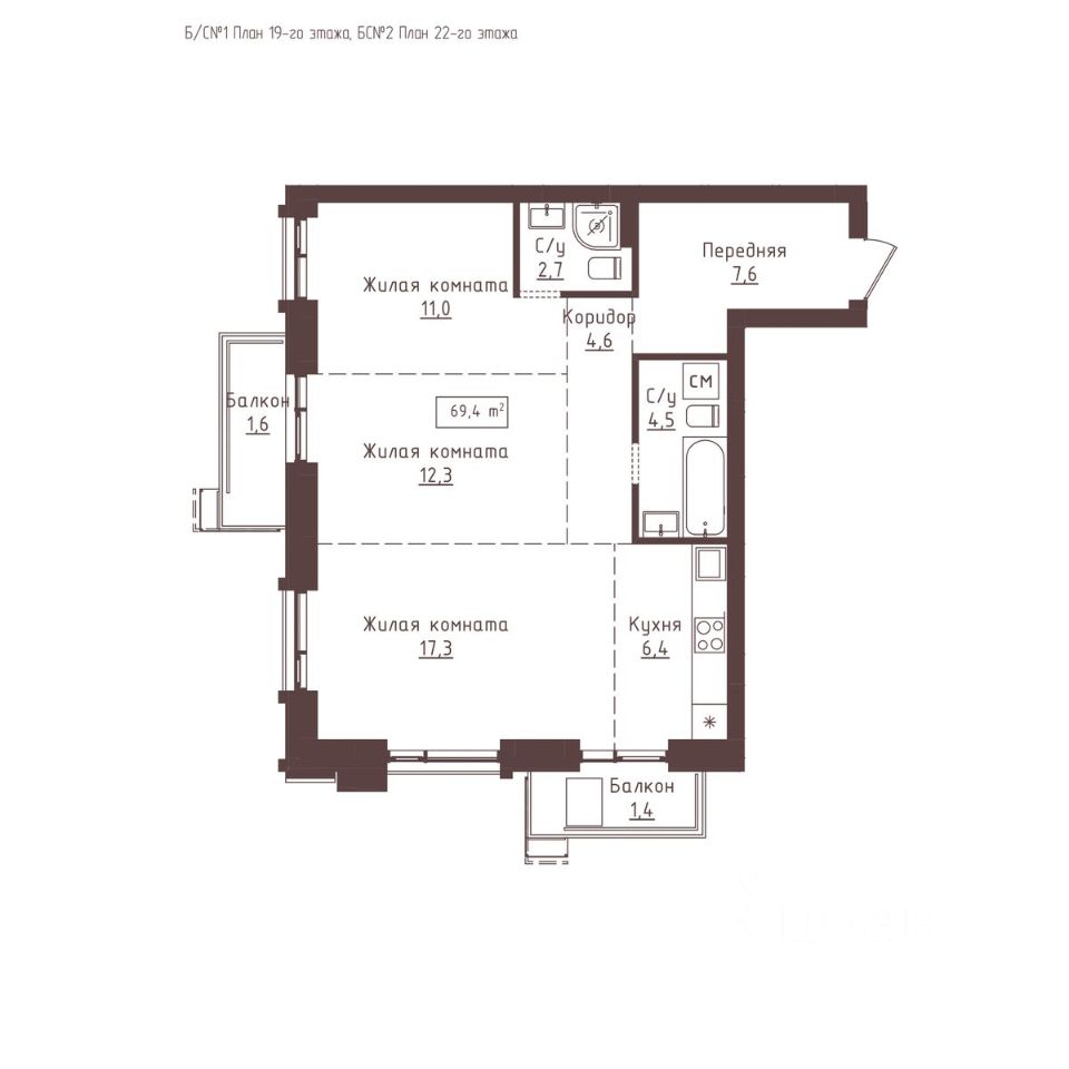 Общая площадь69,4 м²