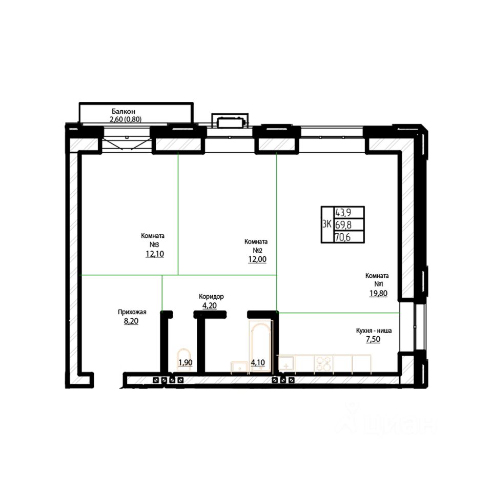Продаётся 3-комнатная квартира в строящемся доме (Дом 1), срок сдачи: IV-кв. 2027, общей площадью 70.6 кв.м., на 3 этаже. Непревзойденная эстетика и комфорт.