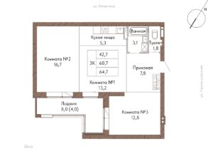 Продаётся 3-комнатная квартира в строящемся доме (Дом 1), срок сдачи: IV-кв. 2028, общей площадью 64.7 кв.м., на 8 этаже. Новый жилой комплекс "Здравствуй" от Специализированного застройщика "Век-Строй" расположен по адресу: г. Барнаул, по ул. Никитина.