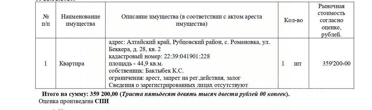 Квартира, кадастровый 22:39:041901:228, площадь 44,9 кв.м., адрес: Алтайский край, Рубцовский район, с. Романовка, ул. Беккера, д. 28, кв. 2. Начальная цена 305 320 руб. (Бактыбек К.С., ипотека, арест, запрещения регистрации) (2447) (повторные)