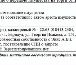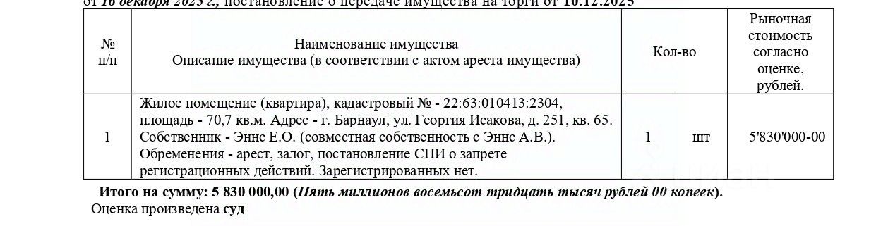 Жилое помещение (квартира), кадастровый 22:63:010413:2304, площадь 70,7 кв.м., адрес: Алтайский край, г. Барнаул, ул. Георгия Исакова, д. 251, кв. 65. Зарегистрированных нет. Начальная цена 4 955 500 руб. (Эннс Е.О. (совместная собственность с Эннс А.В.), ипотека, арест, запрещения регистрации) (2329) (повторные)