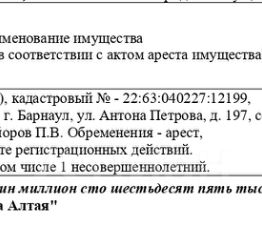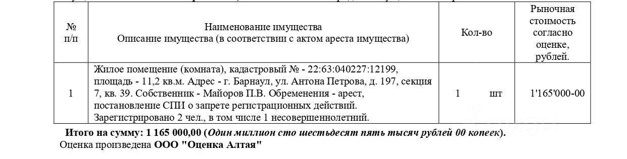 Жилое помещение (комната), кадастровый 22:63:040227:12199, площадь 11,2 кв.м., адрес: Алтайский край, г. Барнаул, ул. Антона Петрова, д. 197, секция 7, кв. 39. Зарегистрировано 2 чел., в том числе 1 несовершеннолетний. Начальная цена 990 250 руб. (Майоров П.В., арест, запрещения регистрации) (2180) (повторные)