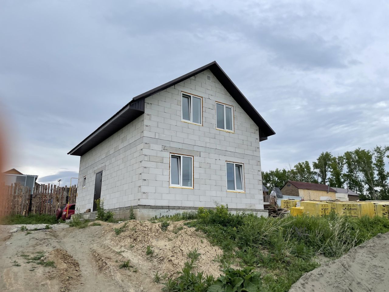 (угловой, проезд очень широкий , можно несколько машин ставить или грузовик с прицепом т. е допом плюс к участку фактически в пользовании еще 4 сотки с 2 х сторон )сибит 300, на цем клей ,перемычки Сибит , штукатурка , шпатлевка, фундамент свайно ростверковый 26 свай 400мм на 3 метра шаг 1,5 метра ростверк 450 на 450, очень мощный и надежный армированный с сапожком под будущую облицовку кирпичем Бетонный армированный рабочей арматурой теплый пол 5 контуров и вывод для радиаторов 5 шт на 1 этаже.. армопояс 250мм , перекрытие деревянное балки через 60 см , потолки подшиты osb,полы на 2 эт настелены , кровля металлочерепица вентилируемая , подшиты карнизы,супердиффузионная мембрана , стропила на 200мм , каменная вата методом задува ,,пароизоляция , для вент каналов сделана заготовка в крыше утеплено .качественная электрика с пропайкой в распредклробках сделана . Окна пятикамерные KBE дорогие, дверь для домов теплая толстая с терморазрывом.