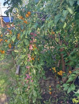 На участке есть кусты жимолости, чёрной смородины, крыжовника, малины, вишня, яблоки, виктория, много многолетних цветов, большая теплица, зона отдыха с детской площадкой. Во дворе тротуарная плитка.