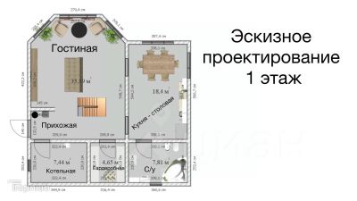 Первый этаж 83 м2, по проекту предусмотрено большая кухня-столовая, гостиная, с/узел, гардеробная, бойлерная, тамбур и холл. Высота потолков 2,9м.