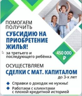 Помогаем воспользоваться субсидией 450 000 рублей за третьего ребенка на покупку жилья (работаем с плохой кредитной историей, с банкротами, с заемщиками, у которых проблемы с судебными приставами)