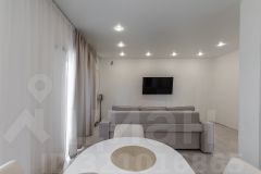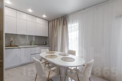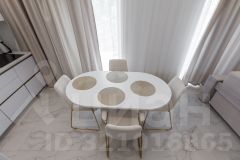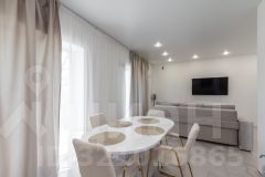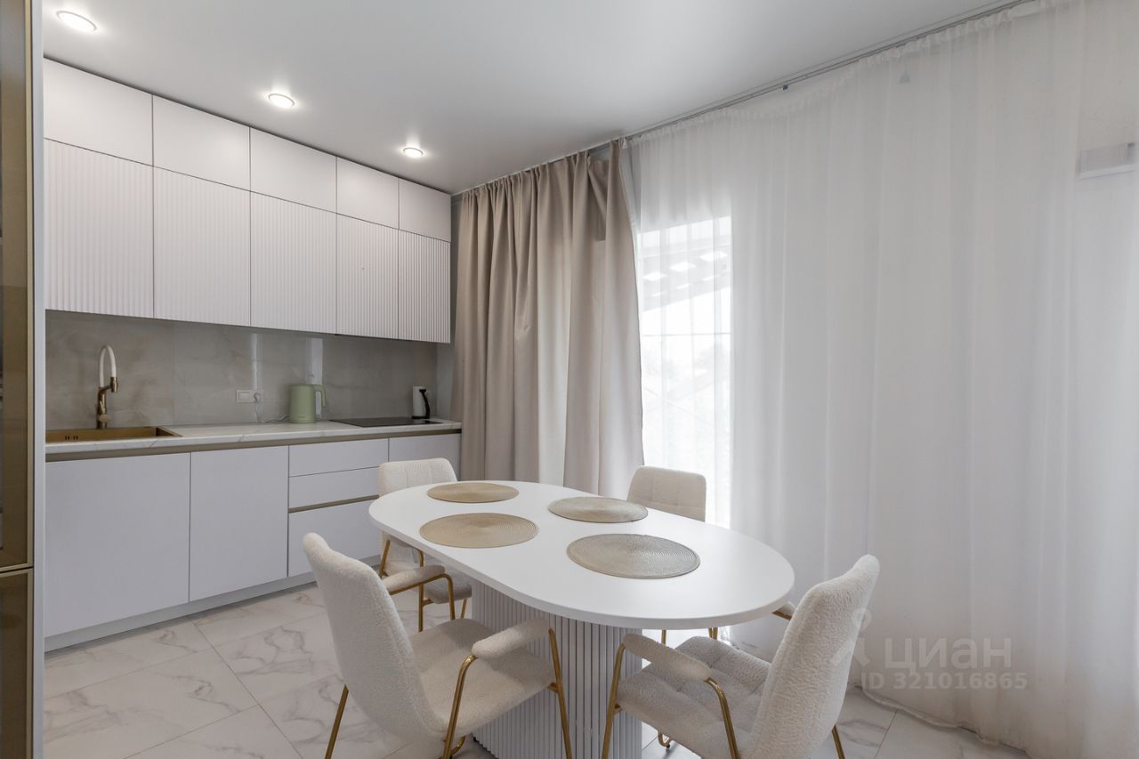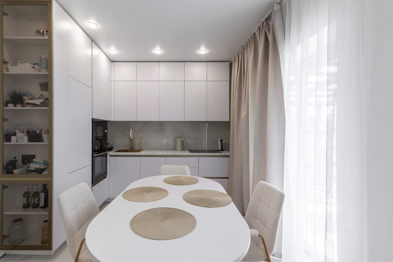 *большая кухня-гостиная с новой современной кухонной системой и встроенной техникой, где можно творить кулинарные шедевры и угощать своих родных за большим круглым столом