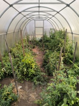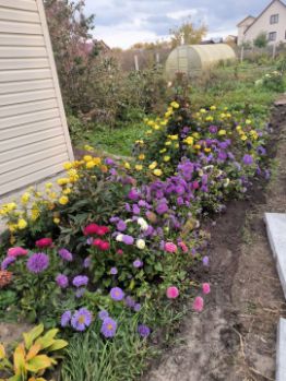 Ухоженный огород с многолетними посадками и теплицей.