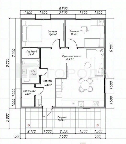 В доме спроектировано отдельное помещение под котельную, коридор, совмещенный санузел, Спальня, детская и большая кухня гостинная, где вы сможете собираться всей семьей или приглашать друзей.