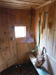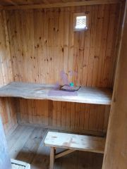 На втором этаже - основная часть дома, сложенная из бруса и обшитая шифером. Потолок этого этажа дополнительно утеплен. Есть место для установки печи, что даст возможность для круглогодичного проживания. Электричество в доме круглый год.