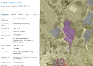 Земельный участок, из земель сельскохозяйственного назначения, с кадастровым номером 54:13:025314:1034, Адрес: Новосибирская область, Краснозерский район, площадью 1587529 кв.м., обременение отсутствует, вид разрешенного исполь...